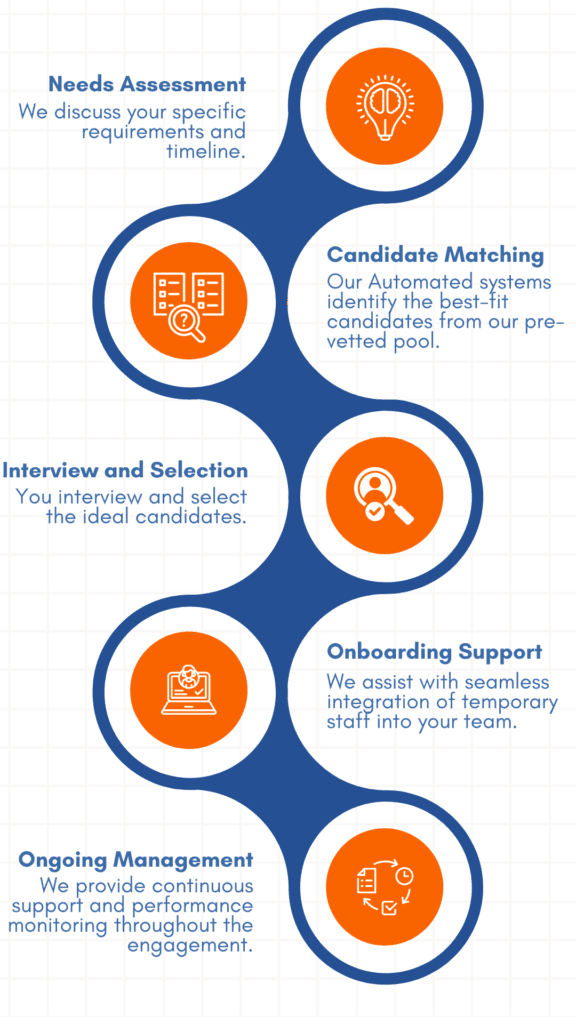 Do you currently experience challenging peaks and troughs in demand and therefore struggle to cope with fluctuating workloads without overstretching your permanent workforce? We provide an end-to-end solution encompassing direct engagement, ranging from embedded temporary staffing to assignment of ad-hoc temporary professionals.